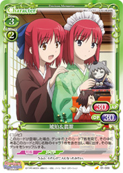 | 〔コンビ〕このカードが登場した場合、デッキの上のカード7枚を見て、その中にあるこのカードと同じ名称のキャラ1枚を抜き出し、場に出す。その後、デッキをシャッフルする。 | ||