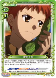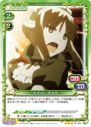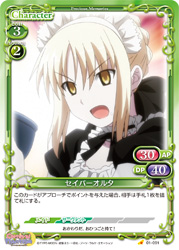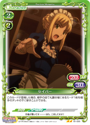 | このカードが登場した場合、デッキの上のカード7枚を見て、その中にある「セイバー」または「遠坂 凛」1枚を抜き出し、表にしてから手札に加える。その後、デッキをシャッフルする。 | ||