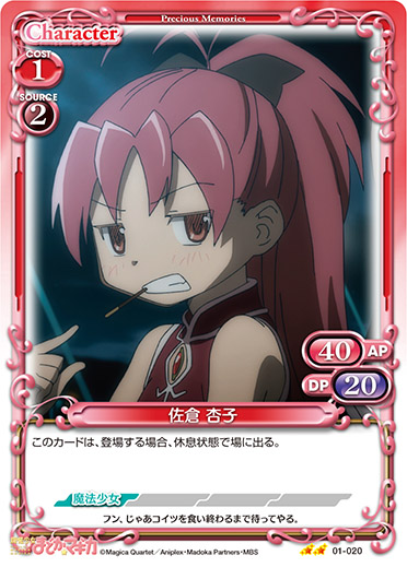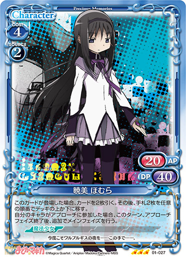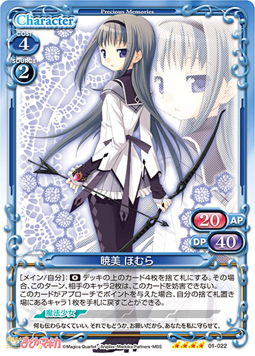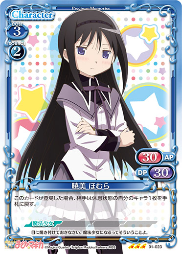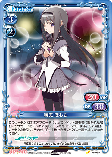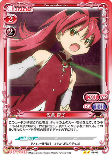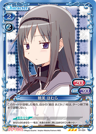 | このカードが退場した場合、自分の「鹿目 まどか」1枚は、ターン終了時まで退場しない。 | ||