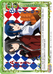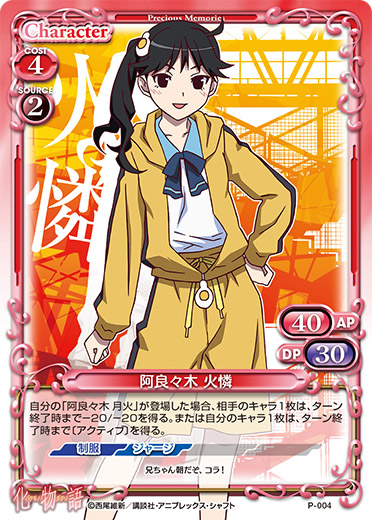 | 自分の「阿良々木 月火」が登場した場合、相手のキャラ1枚は、ターン終了時まで-20/-20を得る。または自分のキャラ1枚は、ターン終了時まで〔アクティブ〕を得る。 | ||