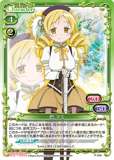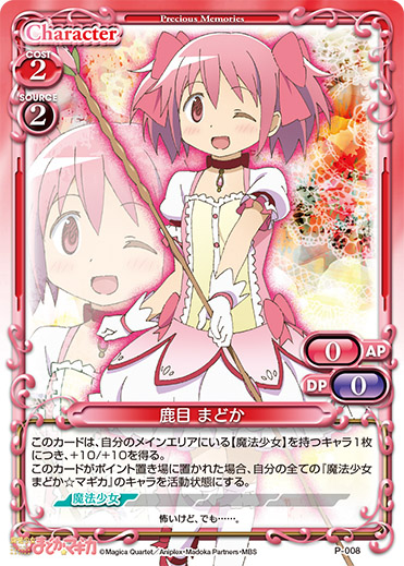 | このカードは、自分のメインエリアにいる【魔法少女】を持つキャラ1枚につき、+10/+10を得る。このカードがポイント置き場に置かれた場合、自分の全ての「魔法少女まどか☆マギカ」のキャラを活動状態にする。 | ||