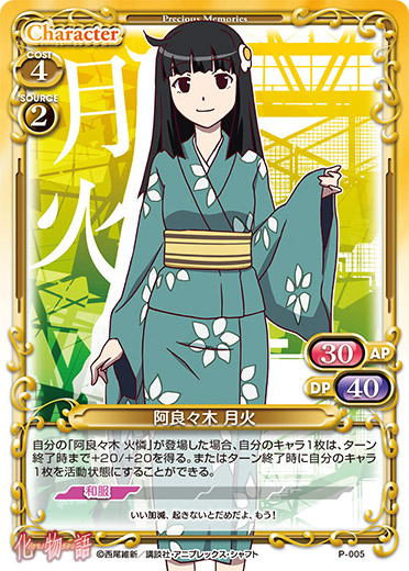 | 自分の「阿良々木 火憐」が登場した場合、自分のキャラ1枚は、ターン終了時まで+20/+20を得る。またはターン終了時に自分のキャラ1枚を活動状態にすることができる。 | ||