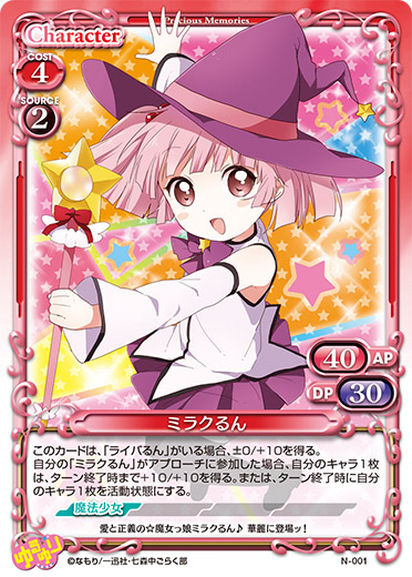 | このカードは、「ライバるん」がいる場合、±0/+10を得る。自分の「ミラクるん」がアプローチに参加した場合、自分のキャラ1枚は、ターン終了時まで+10/+10を得る。または、ターン終了時に自分のキャラ1枚を活動状態にする。 | ||