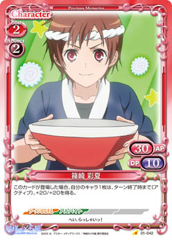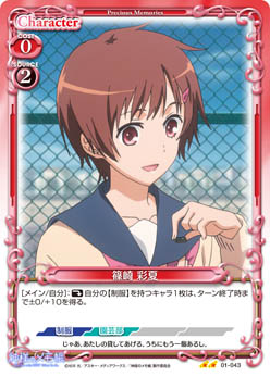 | [メイン/自分]:《休》自分の【制服】を持つキャラ1枚は、ターン終了時まで±0/+10を得る。 | ||