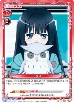 | [メイン/自分]:《休》自分のキャラ1枚を休息状態にする。その場合、自分の「アリス」1枚は、ターン終了時まで+10/±0または±0/+10を得る。 | ||
