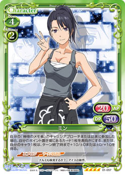 | 自分の『神様のメモ帳』のキャラがアプローチまたは妨害に参加した場合、自分のポイント置き場にあるカード1枚を表向きにする。または、自分のキャラ1枚は、ターン終了時まで+10/±0または±0/+10を得る。 | ||
