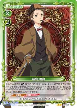 | [メイン/両方]:《休》デッキの上のカード5枚を見て、その中にあるカードを2枚まで捨て札にする。[メイン/両方]:《休》自分の「アリス」1枚は、ターン終了時まで+20/±0または±0/+20を得る。 | ||