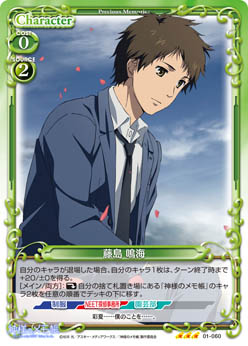 | 自分のキャラが退場した場合、自分のキャラ1枚は、ターン終了時まで+20/±0を得る。[メイン/両方]:《休》自分の捨て札置き場にある『神様のメモ帳』のキャラ2枚を任意の順番でデッキの下に移す。 | ||