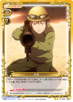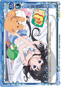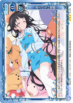 | このカードが妨害に参加した場合、相手の捨て札置き場にあるキャラ1枚を指定する。その場合、そのキャラと同じ名称の相手のキャラ1枚は、このターン、テキストを使用することができない。 | ||