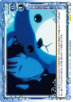 | [メイン/相手]:自分の「アリス」2枚を休息状態にする。その場合、相手のキャラ2枚は、このターン、アプローチに参加することができない。 | ||