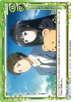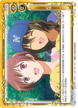 | [メイン/両方]:自分のキャラ2枚を休息状態にする。その場合、自分のポイント置き場にあるカード1枚を手札に加える。その後、手札1枚を表向きの状態でポイント置き場に置く。 | ||