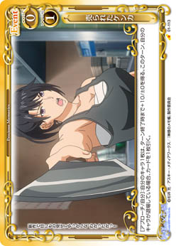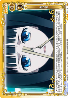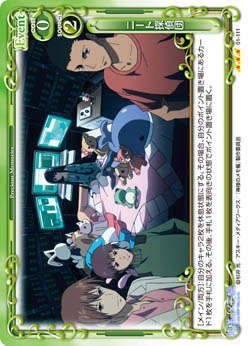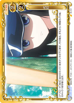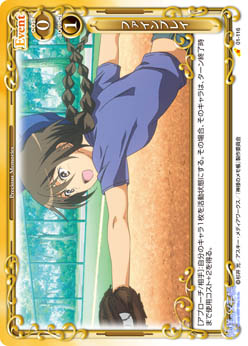 | [メイン/自分]:デッキの上のカード3枚を捨て札にする。捨て札にしたカードの中にキャラが2枚以上含まれている場合、自分の捨て札置き場にあるキャラ1枚を手札に戻すことができる。捨て札にしたカードの中にイベントカードがある場合、ターン終了時にカードを1枚引く。 | ||