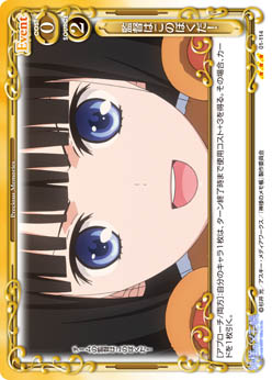 | [メイン/自分]:デッキの上のカード4枚を捨て札にする。その場合、自分のキャラ1枚は、ターン終了時まで退場しない。 | ||