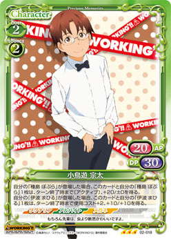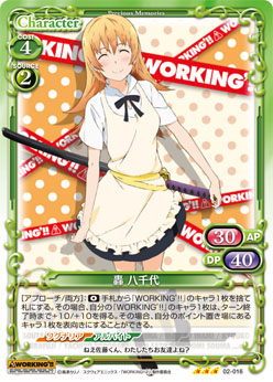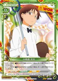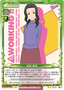 | [アプローチ/両方]:《0》手札から『WORKING’!!』のキャラ1枚を捨て札にする。その場合、自分の『WORKING’!!』のキャラ1枚は、ターン終了時まで+10/+10を得る。その場合、自分のポイント置き場にあるキャラ1枚を表向きにすることができる。 | ||