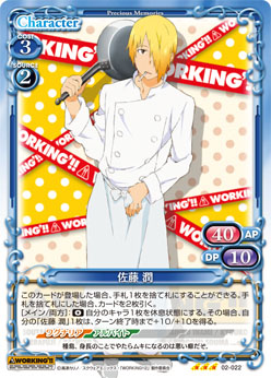 | このカードが登場した場合、手札1枚を捨て札にすることができる。手札を捨て札にした場合、カードを2枚引く。[メイン/両方]:《0》自分のキャラ1枚を休息状態にする。その場合、自分の「佐藤 潤」1枚は、ターン終了時まで+10/+10を得る。 | ||