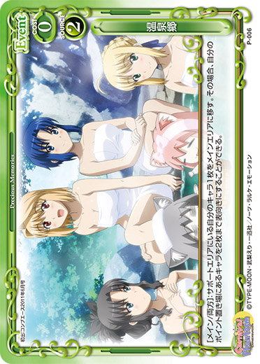 | 〔アクティブ〕このカードのアプローチで相手のキャラが退場した場合、ターン終了時に退場したキャラの使用コストの値と同じ枚数まで自分のキャラを活動状態にすることができる。 | ||