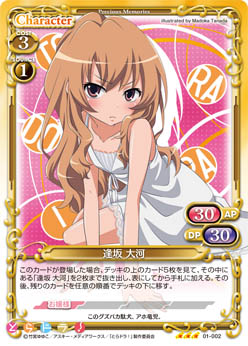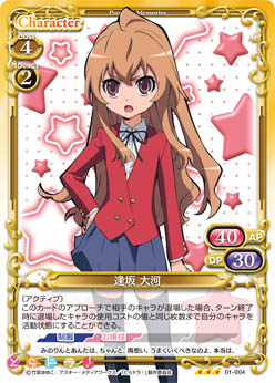 | 〔アクティブ〕このカードがアプローチでポイントを与えた場合、カードを1枚引く。このカードのアプローチで相手のキャラが退場した場合、手札から「逢坂 大河」1枚を場に出すことができる。 | ||
