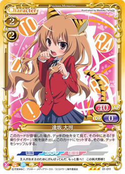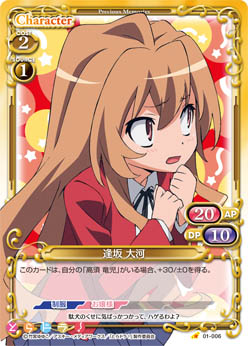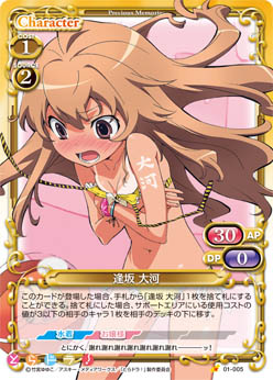 | このカードは、「逢坂 大河」のコストとして使用する場合、発生コスト+2を得る。[アプローチ/相手]:《休》相手のポイント置き場にあるカード1枚を裏向きにする。 | ||
