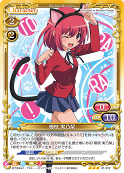 | このカードは、このカード以外の自分の【ネコミミ】を持つキャラがいる場合、+30/+30を得る。このカードが登場した場合、自分の捨て札置き場にある「櫛枝 実乃梨」1枚をサポートエリアに出すことができる。 | ||