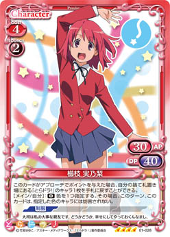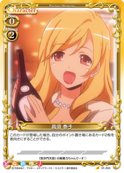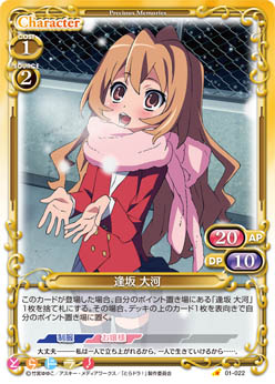 | このカードが登場した場合、自分のポイント置き場にある「逢坂 大河」1枚を捨て札にする。その場合、デッキの上のカード1枚を表向きで自分のポイント置き場に置く。 | ||