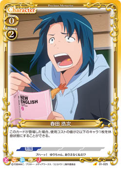 | このカードがアプローチでポイントを与えた場合、自分の捨て札置き場にある『とらドラ!』のキャラ1枚を手札に戻すことができる。[メイン/自分]:《0》色を1つ指定する。その場合、このターン、このカードは、指定した色のキャラには妨害されない。 | ||