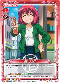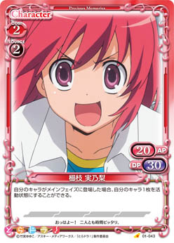 | [メイン/自分]:《休》自分の「櫛枝 実乃梨」1枚は、ターン終了時まで+20/±0を得る。 | ||