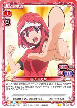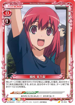 | 自分の「櫛枝 実乃梨」がアプローチに参加した場合、そのキャラがアプローチに参加している間、全てのプレイヤーは、キャラのテキストを使用することができない。 | ||