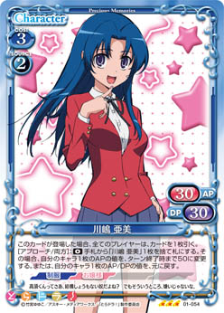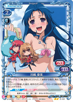 | このカードは、「川嶋 亜美」のコストとして使用する場合、発生コスト+2を得る。このカードが登場した場合、相手のデッキの上のカード3枚を捨て札にすることができる。 | ||