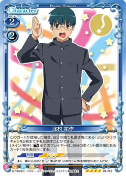| このカードが登場した場合、自分の捨て札置き場にある『とらドラ!』のキャラを2枚まで手札に戻すことができる。[メイン/相手]:《休》全てのプレイヤーは、自分のポイント置き場にあるカード1枚を表向きにする。 | ||