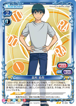 | このカードは、自分の「高須 竜児」がいる場合、+10/+10を得る。このカードが登場した場合、デッキの中を全て見て、その中にある「高須 竜児」1枚を抜き出し、表にしてから手札に加える。その後、デッキをシャッフルする。 | ||