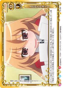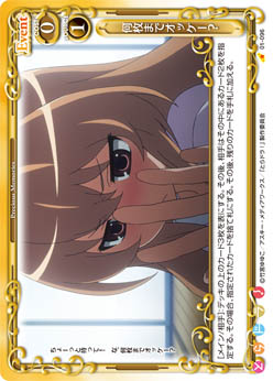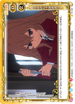 | [アプローチ/自分]:活動状態の自分の『とらドラ!』のキャラ1枚をデッキの下に移す。その場合、ターン終了時に手札からデッキの下に移したキャラと同じ名称のキャラ1枚を場に出すことができる。 | ||
