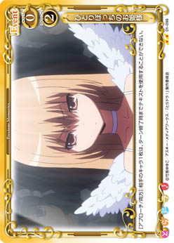 | [メイン/自分]:デッキの上のカード3枚を捨て札にする。その場合、自分のキャラ1枚は、ターン終了時まで+20/+20を得る。その場合、ターン終了時にカードを1枚引く。 | ||