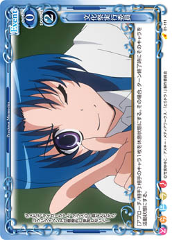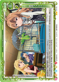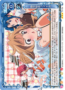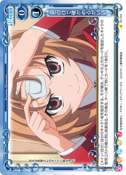 | 《使用条件》:「高須 竜児」「高須 泰子」「インコちゃん」[メイン/自分]:デッキの中を全て見て、その中にある『とらドラ!』のキャラ1枚を抜き出し、表にしてから手札に加える。その後、デッキをシャッフルする。 | ||