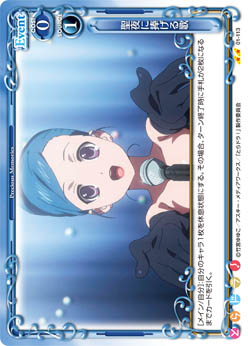 | [アプローチ/自分]:自分のキャラ1枚を指定する。その後、自分、または相手のデッキの上のカード3枚を捨て札にする。その場合、指定したキャラは、捨て札にしたカードの中に含まれている指定したキャラと同じ名称のキャラ1枚につき、ターン終了時まで+10/+10を得る。 | ||