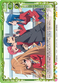 | [メイン/自分]:自分の捨て札置き場にある任意の枚数の『とらドラ!』のキャラをデッキに戻し、デッキをシャッフルする。その場合、デッキに戻したキャラ7枚につき、カードを1枚引く。 | ||