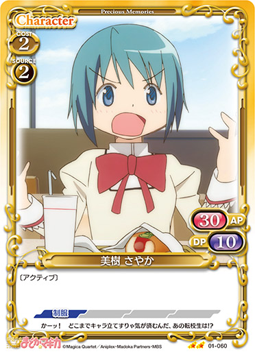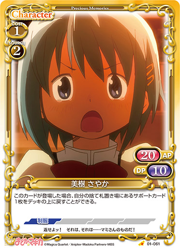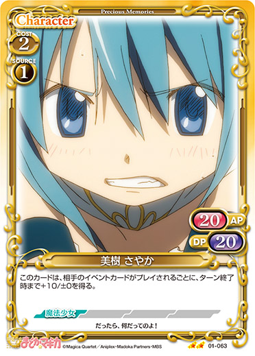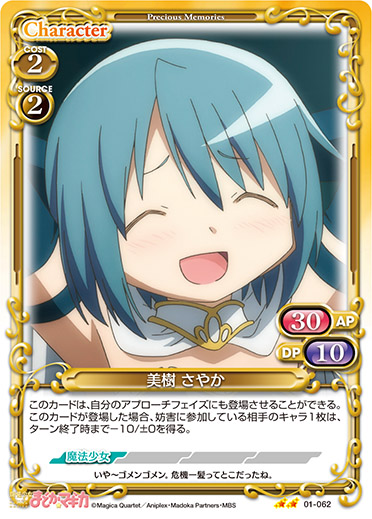 | このカードは、自分のアプローチフェイズにも登場させることができる。このカードが登場した場合、妨害に参加している相手のキャラ1枚は、ターン終了時まで-10/±0を得る。 | ||