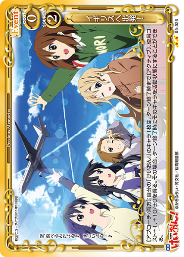 | このカードをプレイする場合、以下から1つ選択する。・[メイン/自分]:手札2枚と、自分のポイント置き場にある『けいおん!』のカード2枚を置き換える。・[メイン/相手]:相手のキャラ1枚は、このターン、アプローチに参加することができない。 | ||
