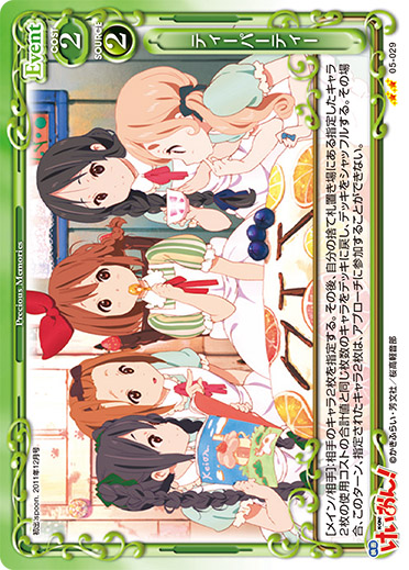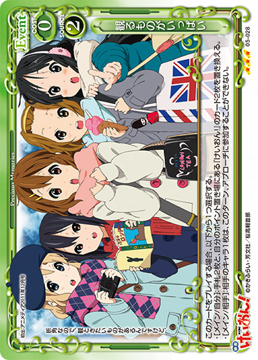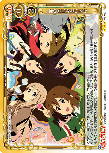 | このカードをプレイする場合、以下から1つ選択する。・[メイン/両方]:手札から使用コストの値が3以下の『けいおん!』のキャラ1枚を場に出す。・[メイン/自分]:使用コストの値が3以下の相手のキャラ1枚を休息状態にする。 | ||