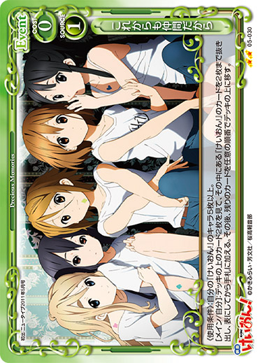 | 《使用条件》:自分の『けいおん!』のキャラ5枚以上。[メイン/自分]:デッキの上のカード2枚を見て、その中にある『けいおん!』のカードを2枚まで抜き出し、表にしてから手札に加える。その後、残りのカードを任意の順番でデッキの上に移す。 | ||