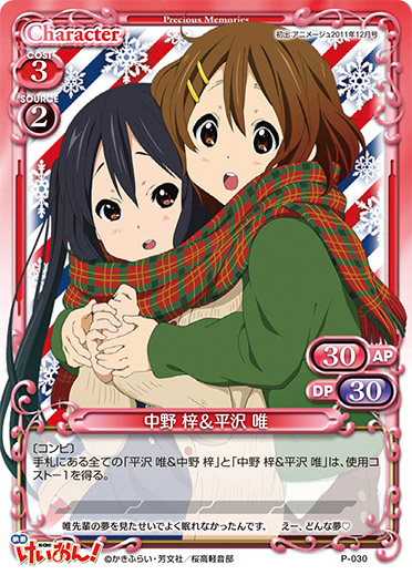 | 〔コンビ〕手札にある全ての「平沢 唯&中野 梓」と「中野 梓&平沢 唯」は、使用コスト-1を得る。 | ||