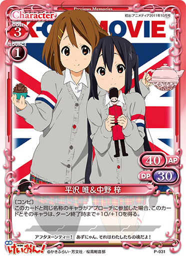 | [アプローチ/両方]:自分の『けいおん!』のキャラ1枚は、ターン終了時まで〔アクティブ〕、使用コスト+1、+10/±0を得る。その場合、ターン終了時にそのキャラを活動状態にすることができる。 | ||