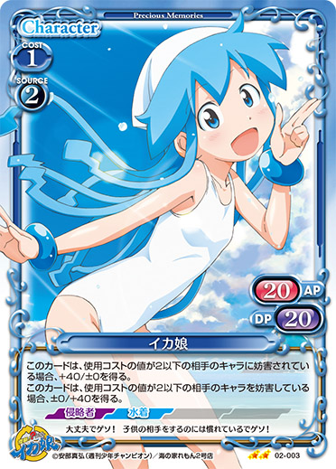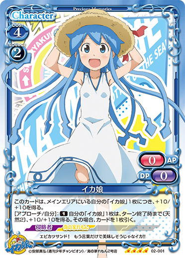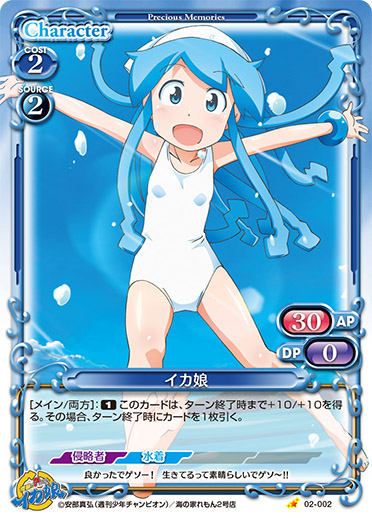 | このカードは、メインエリアにいる自分の「イカ娘」1枚につき、+10/+10を得る。[アプローチ/自分]:《1》自分の「イカ娘」1枚は、ターン終了時まで〔天然2〕、+10/+10を得る。その場合、カードを1枚引く。 | ||
