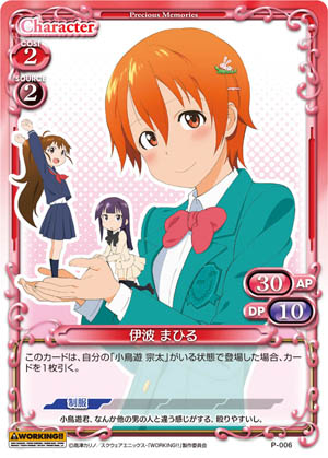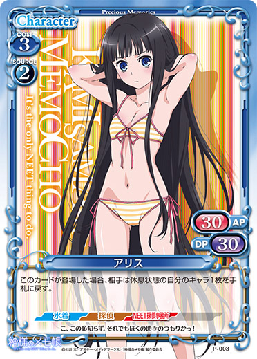 | このカードが退場した場合、デッキの上のカード3枚を見て、その中にある【水着】を持つキャラ1枚を休息状態で場に出す。その後、残りのカードを任意の順番でデッキの下に移す。 | ||