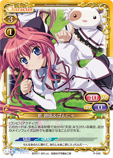 | このカードは、相手のポイント置き場にカードが3枚以上ある場合、+20/+20を得る。 このカードは、相手のポイント置き場にカードが5枚以上ある場合、〔アクティブ〕、〔天然2〕を得る。 | ||