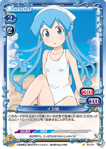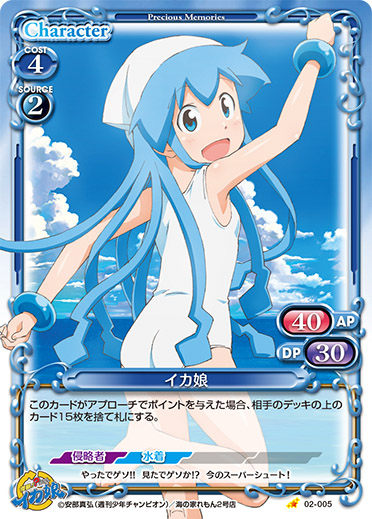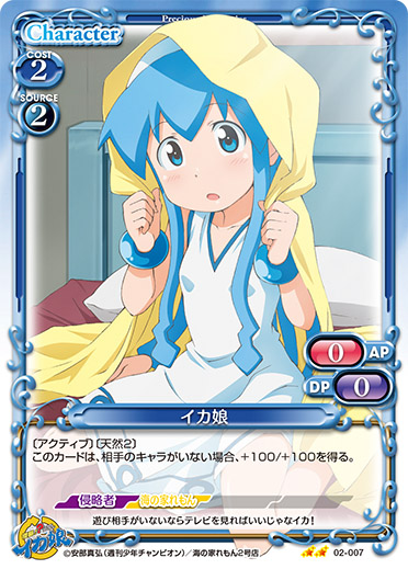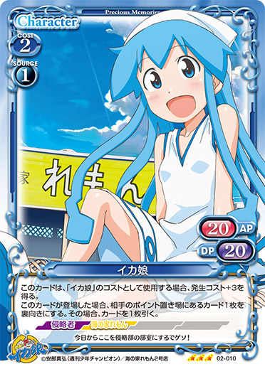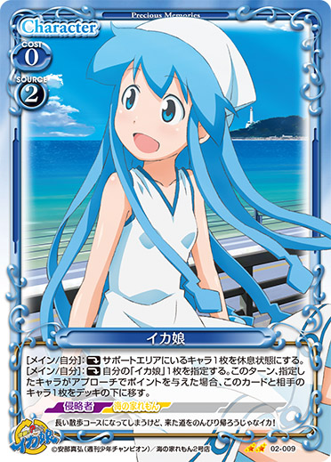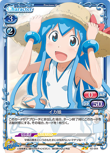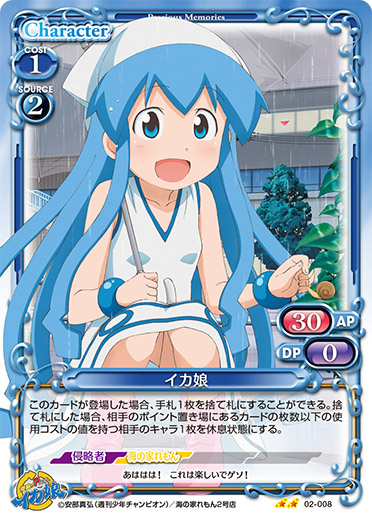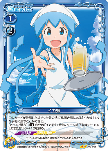 | このカードは、「イカ娘」のコストとして使用する場合、発生コスト+3を得る。このカードが登場した場合、相手のポイント置き場にあるカード1枚を裏向きにする。その場合、カードを1枚引く。 | ||