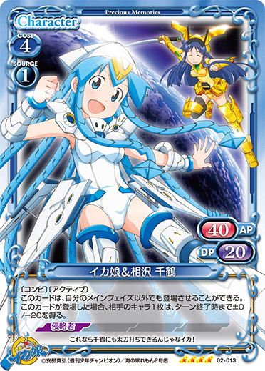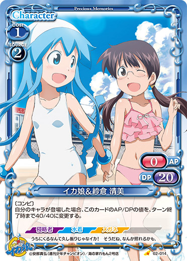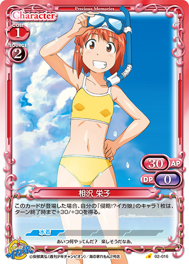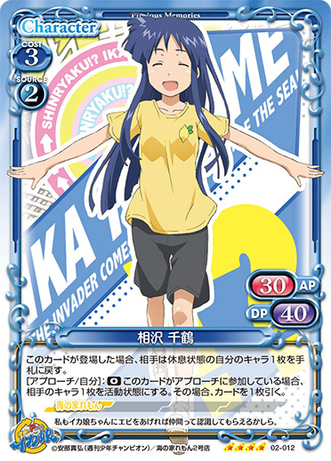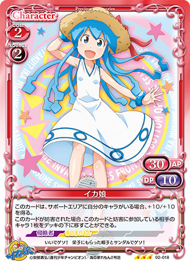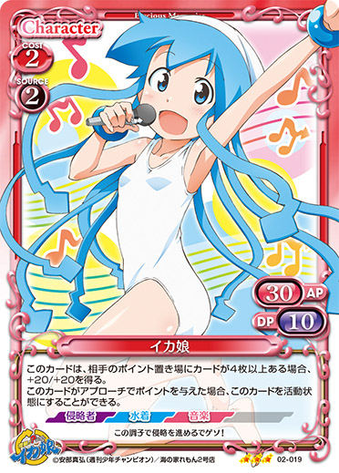 | このカードが登場した場合、自分の『侵略!?イカ娘』のキャラ1枚は、ターン終了時まで+30/+30を得る。 | ||