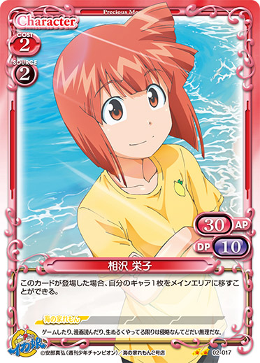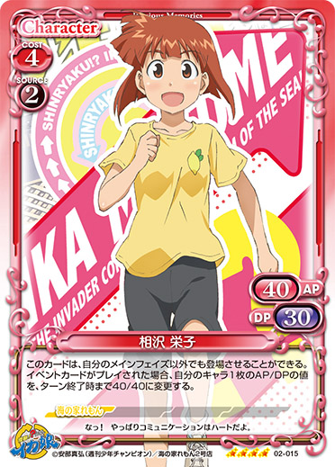 | このカードは、自分のメインフェイズ以外でも登場させることができる。イベントカードがプレイされた場合、自分のキャラ1枚のAP/DPの値を、ターン終了時まで40/40に変更する。 | ||