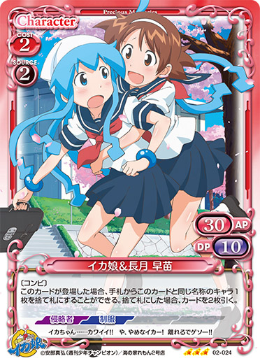 | 〔コンビ〕自分のイベントカードがプレイされるごとに、相手のキャラ1枚は、ターン終了時まで±0/-30を得る。または、このカードを妨害している相手のキャラ1枚を手札に戻す。 | ||