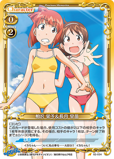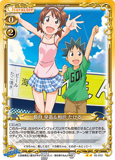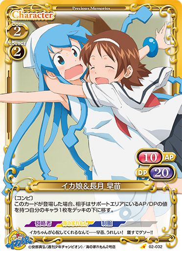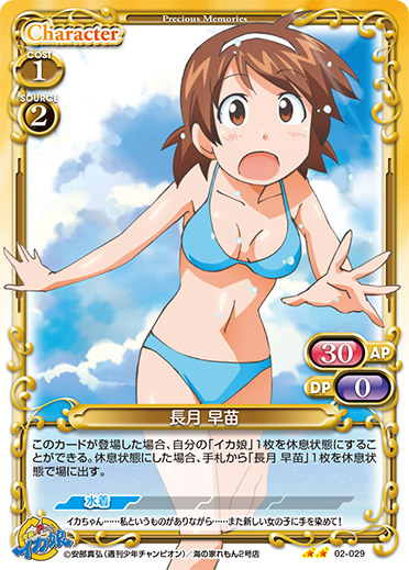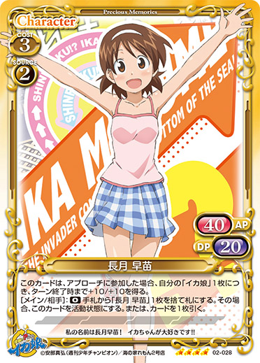 | このカードが登場した場合、自分の「イカ娘」1枚を休息状態にすることができる。休息状態にした場合、手札から「長月 早苗」1枚を休息状態で場に出す。 | ||