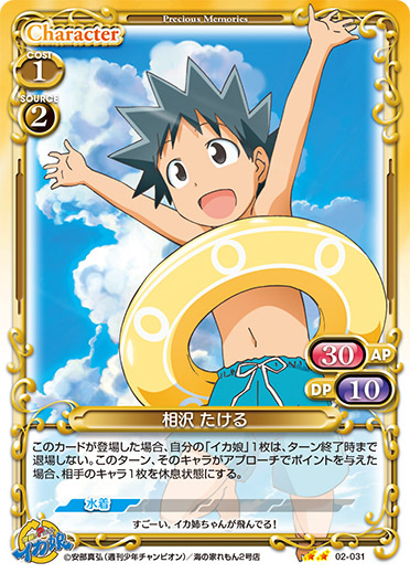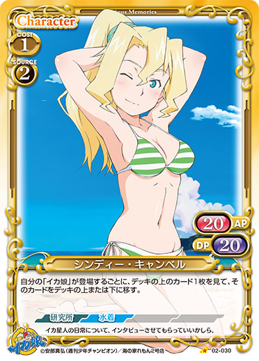 | このカードが登場した場合、自分の「イカ娘」1枚は、ターン終了時まで退場しない。このターン、そのキャラがアプローチでポイントを与えた場合、相手のキャラ1枚を休息状態にする。 | ||